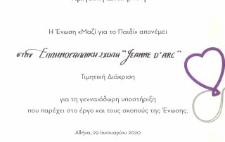 Έντονη συγκίνηση, συναισθήματα και στιγμές καθηλωτικές ήταν τα κυρίαρχα στιγμιότυπα από την τελετή των Βραβείων της Ένωσης Μαζί για το Παιδί. Στην τελετή βραβείων της Ένωσης, τιμήθηκαν οι αφανείς ήρωες της καθημερινότητας, χορηγοί που στηρίζουν το έργο της, εθελοντές, καλλιτέχνες και δημοσιογράφοι. Η Σχολή μας έλαβε τιμητική διάκριση ως χορηγός.