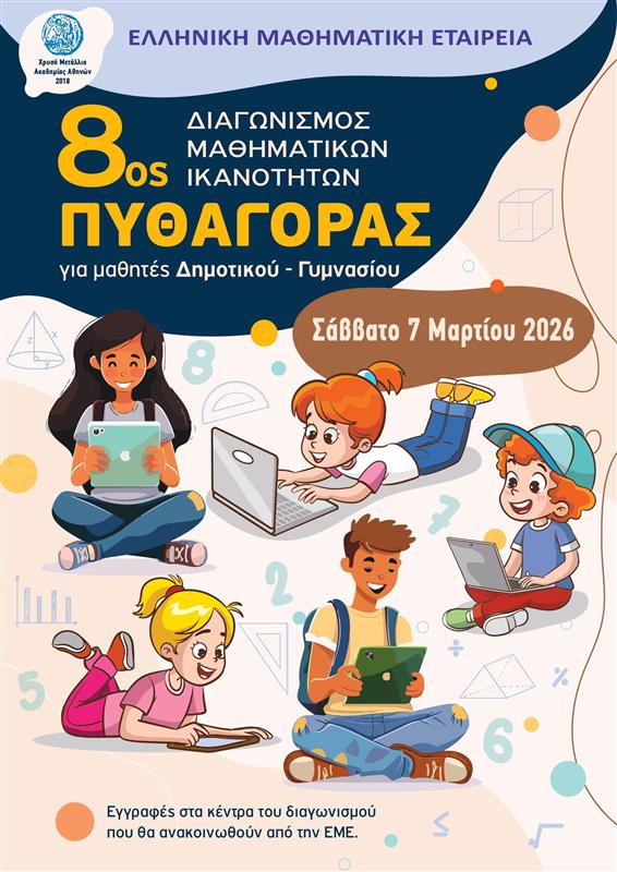 Επιθυμούμε να σας ενημερώσουμε για τη συμμετοχή του σχολείου μας στον διαγωνισμό της Ελληνικής Μαθηματικής Εταιρείας (ΕΜΕ) «Πυθαγόρας», ο οποίος θα πραγματοποιηθεί το Σάββατο, 7 Μαρτίου 2026.