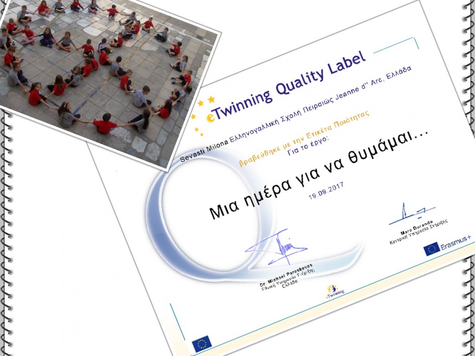 Το project eTwinning “Μια ημέρα για να θυμάμαι” που υλοποιήθηκε την περσινή χρονιά βραβεύτηκε με εθνική ετικέτα ποιότητας. Οι μαθητές και οι μαθήτριες που βραβεύονται είναι τα παιδιά που ήταν στο Νηπιαγωγείο μας (φετινοί μαθητές της Α τάξης), τα παιδιά του Προνηπίου (φετινό Νηπιαγωγείο) και τα παιδιά του περσινού Β1 (φετινό Γ1).