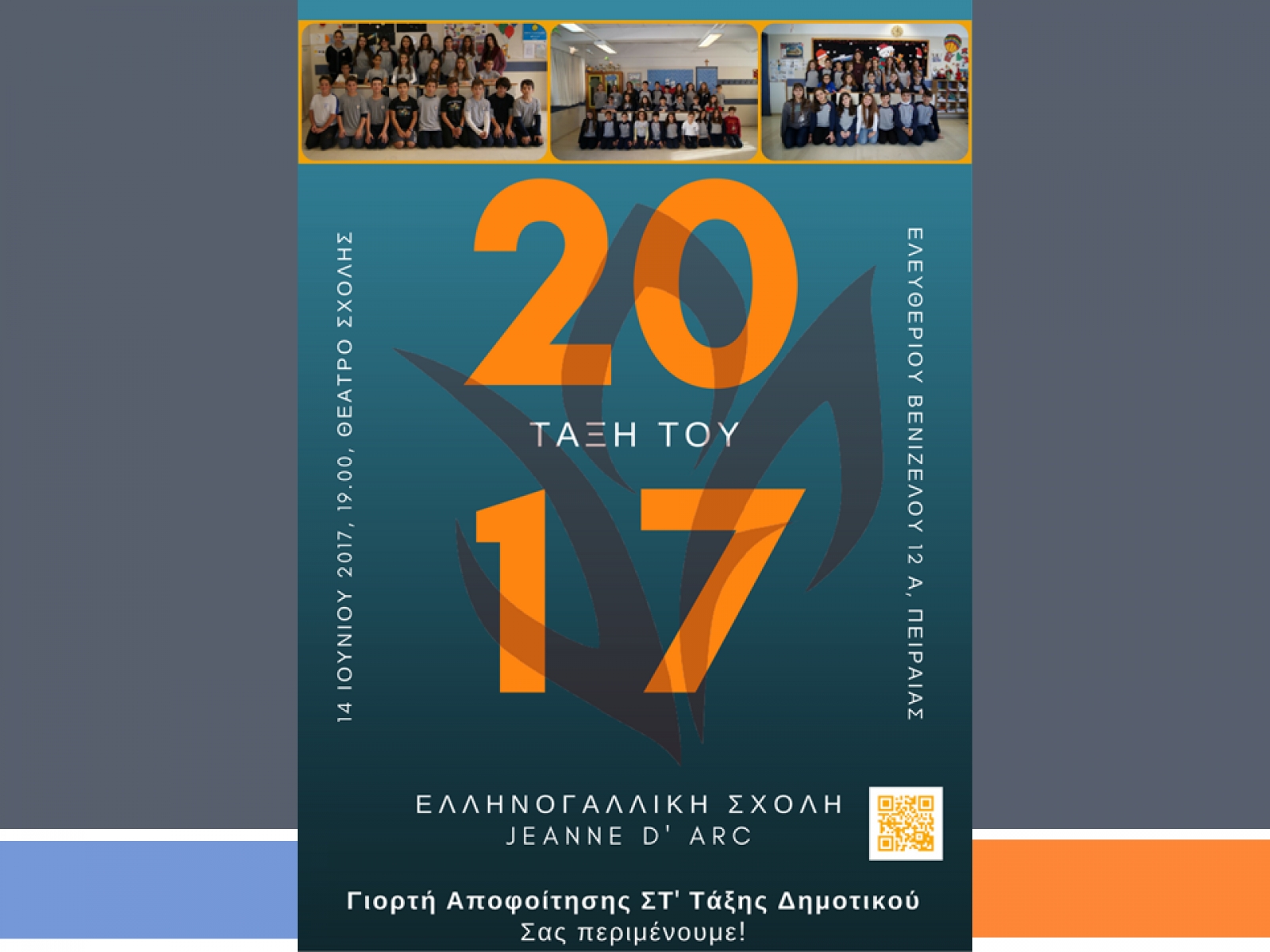 Τα παιδιά της ΣΤ’ τάξης μας προσκάλεσαν στην εκδήλωση που ετοίμασαν για να γιορτάσουν την πιο όμορφη μέρα του δημοτικού! Οι Αδελφές, ο Γενικός Διευθυντής και η μεγάλη οικογένεια της “Jeanne d’ Arc” εύχονται στα παιδιά μας καλή πρόοδο και ΚΑΛΟ ΚΑΛΟΚΑΙΡΙ!